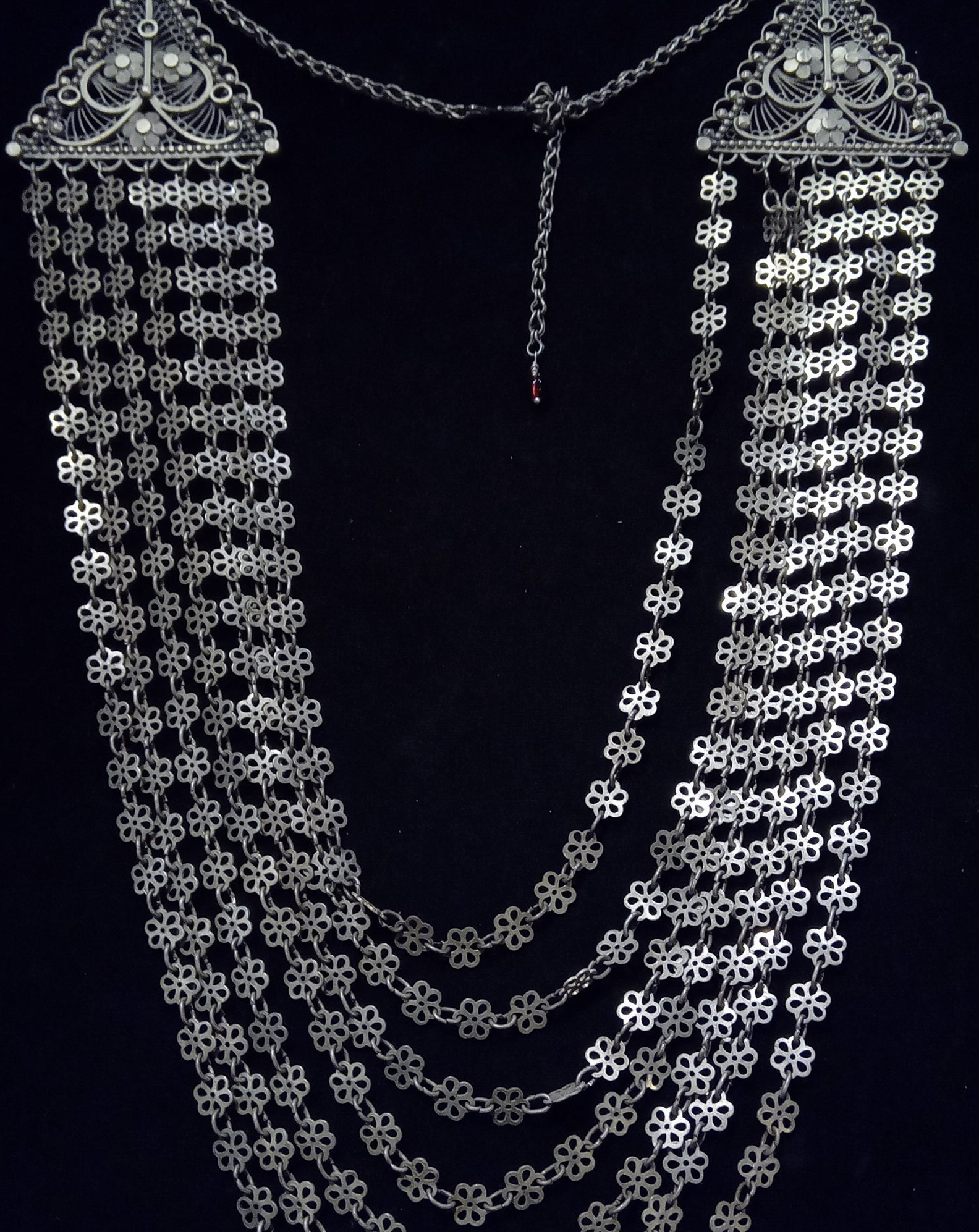 प्रत्येक चेन का अंत त्रिकोणीय चांदी की प्लेट से जुड़ा होता है, जिस पर सुंदर नक़्क़ाशी (नकशी) होती है। ये नक़्क़ाशी पारंपरिक रूपांकनों जैसे फूलों और बेलों को दर्शाती हैं, जो कारीगर की कुशलता को दर्शाती है।